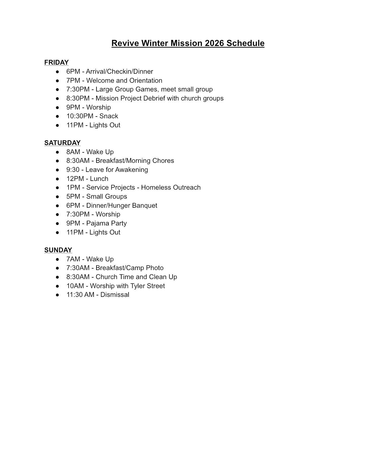 Revive Winter Mission will be held at Tyler Street Global Methodist Church and is $200 per student (grades 6–12) and adult sponsors. Join us as we begin on Friday at 6 PM (dinner included) and conclude on Sunday at noon before lunch.